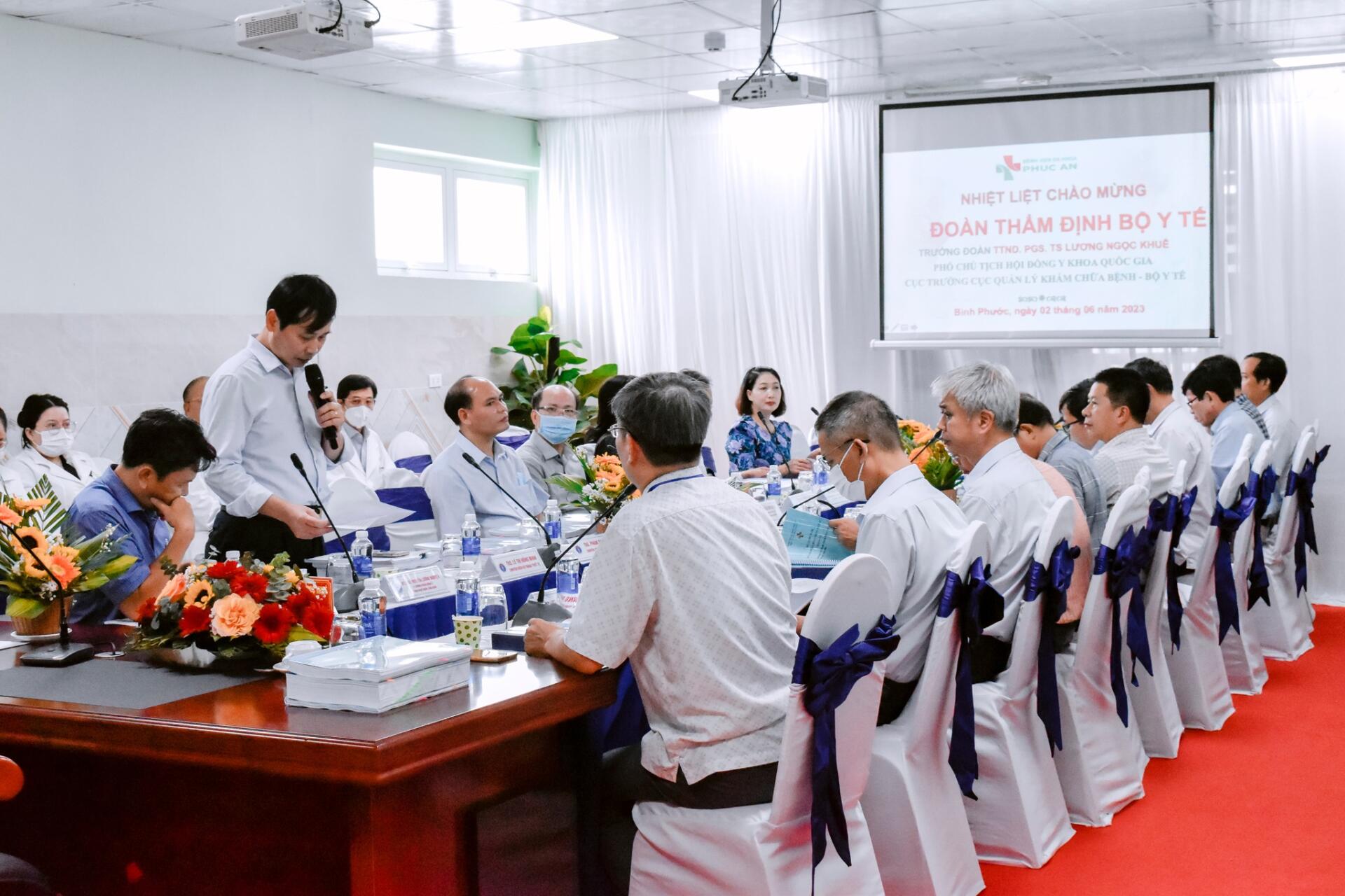 Trong buổi thẩm định, Bác sĩ chuyên khoa II Lê Văn Thế – Giám đốc Bệnh viện Đa Khoa Phúc An đã báo cáo lịch sử hình thành BV, tình hình cơ sở vật chất, trang thiết bị y tế, quy trình kỹ thuật cũng như nguồn nhân lực và phương hướng phát triển.