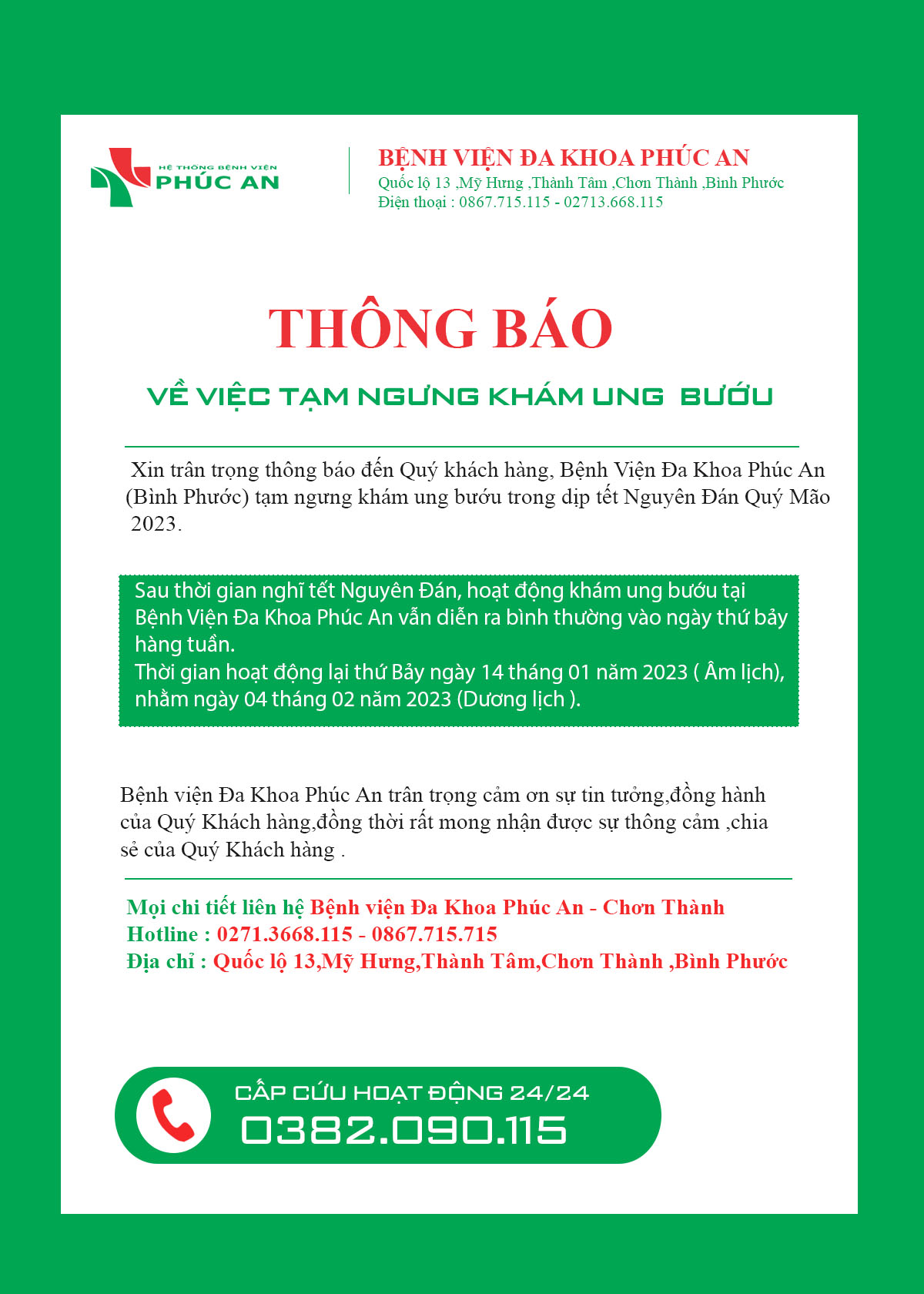 Trân trọng thông báo đến Quý Khách hàng – Bệnh viện Đa Khoa Phúc An ( Bình Phước ) tạm ngưng khám ung bướu trong dịp Tết Nguyên Đan Quý […]